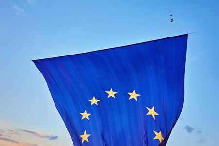 The national flag of European Union floating over blue sky