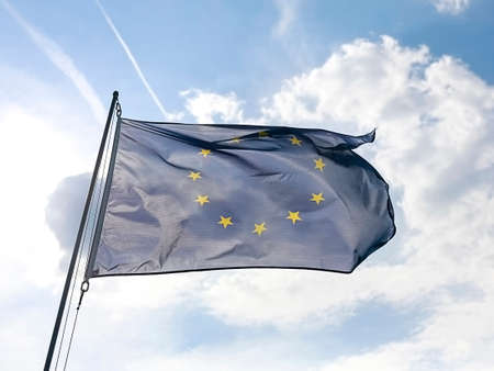 European Union flag at a flagpole moving in the wind against the sky