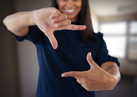 Closeup of hands, Smiling Business Woman Making Frame Gesture with at modern bright coworking open space startup office.