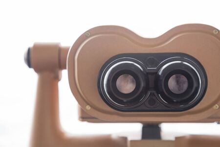 Public stationary binocular on sea shore, Coin operated metal binocular viewer on blurred background sea