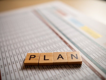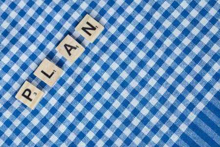A minimalistic flat lay image featuring the word 'PLAN' made from tiles on a marble surface. Perfect for illustrating organization and strategic concepts.