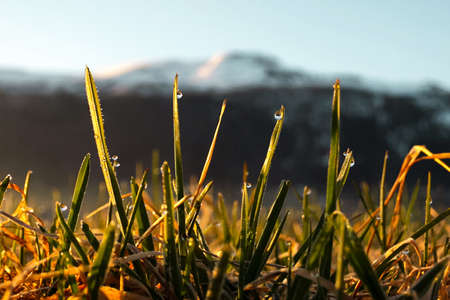 Closeup of grass and leafs with beautiful orange evening sunset. Lensflare and warm colors