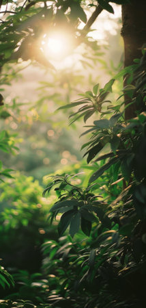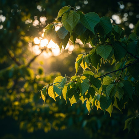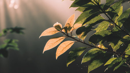 A beautiful image capturing sunlight filtering through lush green leaves, highlighting their intricate details and evoking a sense of tranquility in nature's embrace.