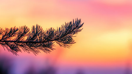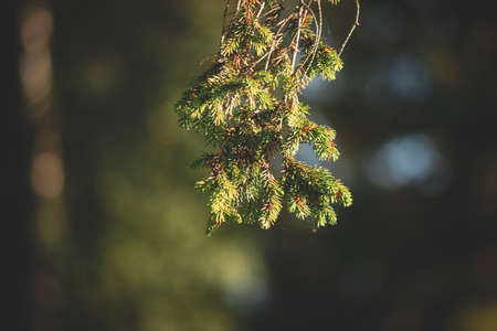 Spruce tree branch in the forest. Selective focus, shallow depth of field.