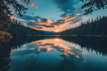 A breathtaking sunset over a still mountain lake, with the reflection of the colorful clouds in the water.
