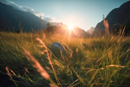 Golden light casts a warm glow on lush green grass, creating a peaceful atmosphere at dusk.