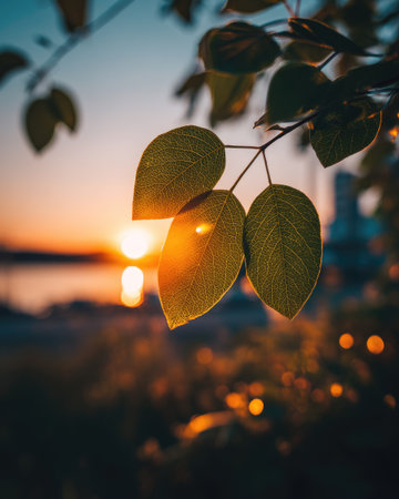 A close-up shot captures three vibrant green leaves on a branch, illuminated by warm sunlight. The background features a soft, blurred sunset, suggesting an outdoor setting. The image uses a shallow depth of field, emphasizing the leaves' textures and details. Suitable for commercial and editorial purposes.