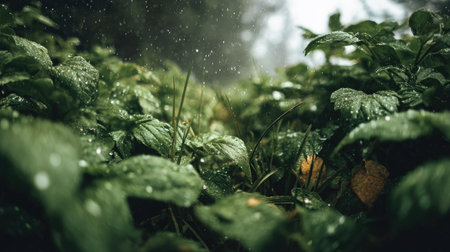 A panoramic wide view of Nance field growing closely together under light drizzle soft raindrops on leaves ultra realistic photography natural daylight cinematic wide composition lifelike natural scene