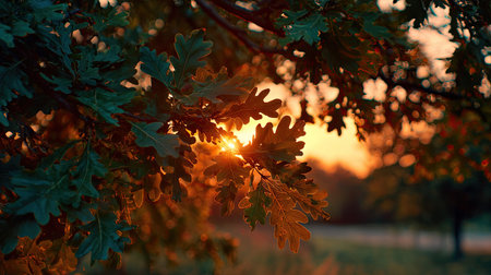 The White oak at sunset, Golden red sunset light filters through the leaves, still atmosphere, warm orange glow blending with natural green tones.