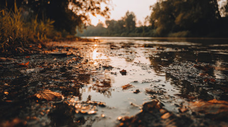 A serene river scene at sunset, featuring reflections of trees on the water surface, surrounded by wet leaves, capturing peaceful outdoor beauty and tranquility.