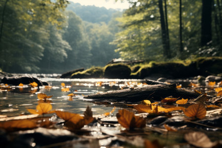 An AI generated illustration of a creek and orange autumn leaves in the forest