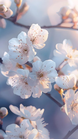 A close-up shot showcases the delicate beauty of cherry blossoms in full bloom, their soft pink petals illuminated against a blurred, atmospheric backdrop.