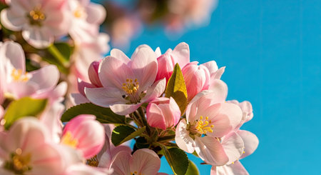 background with spring apple blossom. Blossoming branch in springtime Blooming apple tree in spring time.fresh Apple tree twig with flowers and leaves on garden