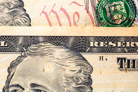 Selective focus on detail of USD banknotes. Close up macro detail of United States Dollars banknotes. World money concept, inflation and economy concept