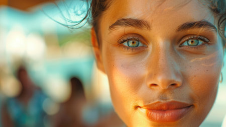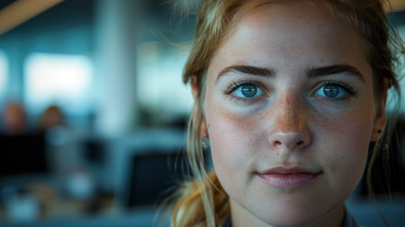Close-up portrait of beautiful young woman with green eyes looking at camera