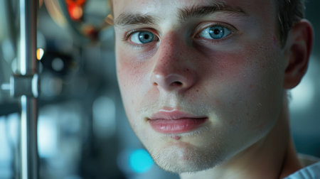 Close-up portrait of a young Lithuanian male engineer in an industrial setting.
