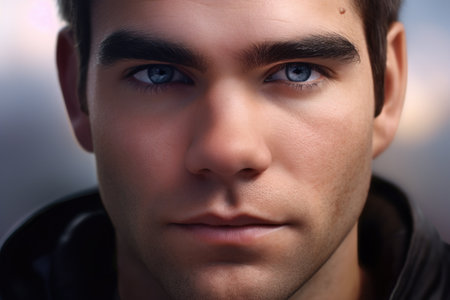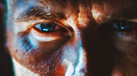 A close-up view of a man staring directly at the camera, revealing striking blue eyes. The intense gaze of the man captivates the viewers attention, drawing them into the depth and clarity of his blue eyes.