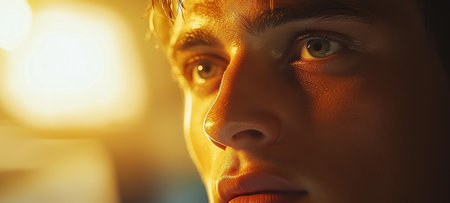 Close view of a young mans facial features showcasing smooth skin and focused expression