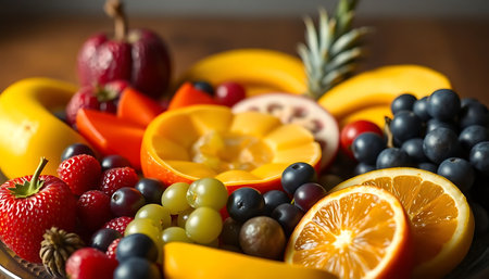 Vibrant assortment of freshly sliced fruits. Generative AI illustration