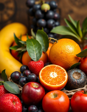 The display features an abundant assortment of fresh fruits, showing a vivid array of colors. Bright oranges, purple deeps, and lush greens harmonize together, creating an enticing and inviting natural scene. This captivating arrangement highlights the freshness and variety of nature's bounty, perfect for any health-conscious individual.