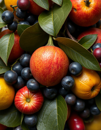 An AI generated illustration of A brightly colored still life of assorted fresh fruits, featuring a blueberry, strawberry, blackberry and apple