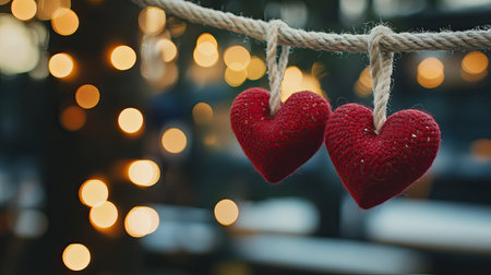 Two vibrant red knitted hearts hang from a rustic rope, illuminated by soft bokeh lights in the background, creating a warm and romantic atmosphere perfect for celebrating love.
