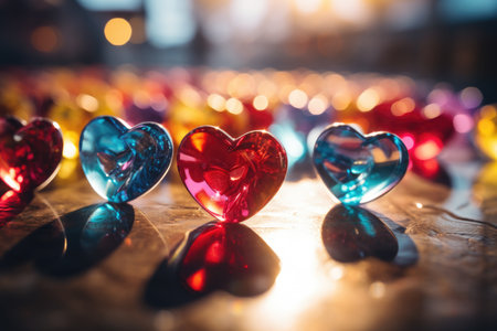 A collection of glittery heart-shaped decorations arranged in a row, set against a soft, blurred background of warm bokeh lights.