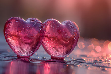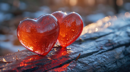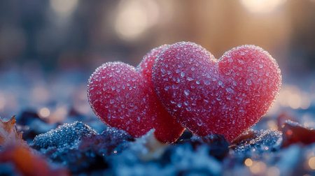 Frosted red hearts side by side on a cool surface, surrounded by a gentle light, symbolizing love, warmth, and togetherness in a serene, winter-like atmosphere.