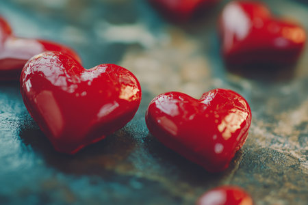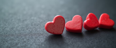 Four vibrant red heart-shaped candies are artfully arranged on a sleek, dark surface, creating a striking contrast that draws the eye. The glossy texture of the hearts glimmers softly, evoking feelings of love and sweetness, perfect for romantic occasions or heartfelt gestures.