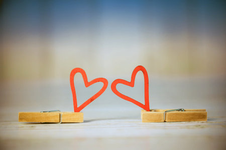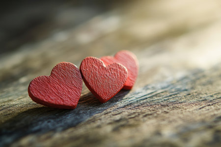 Romantic red heart figurines on textured surface with soft bokeh background.