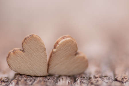 Two pink hearts on wooden table over blue background. Valentines day concept.