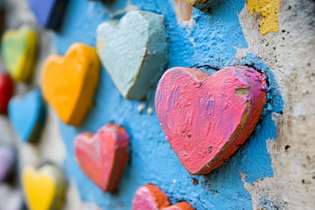 Vibrant and colorful heart graffiti art symbolizing love on an urban wall in a lively city setting