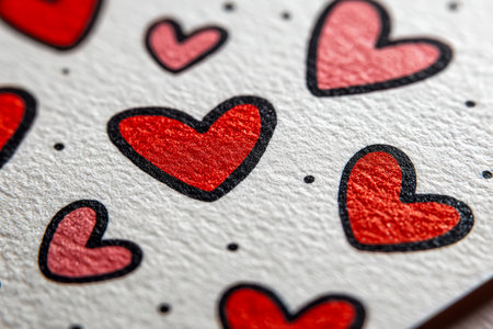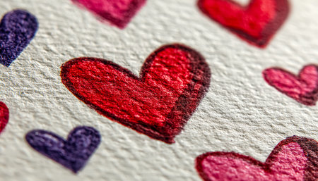 Delicate watercolor hearts in shades of crimson and blush cascade across a rough paper backdrop, evoking love and warmth perfect for romantic designs.