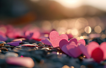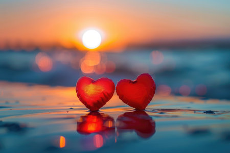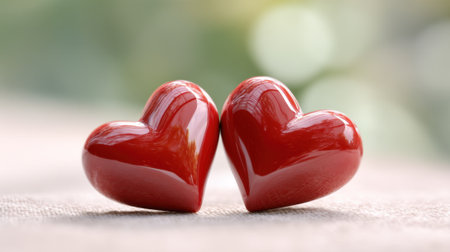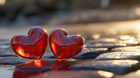 Two shiny red glass hearts resting on a pebbled surface, capturing the essence of love and romance during a serene sunset ambiance. Perfect for Valentine's themes.