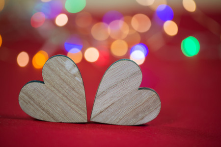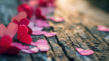 Red paper hearts on wooden table with bokeh background, valentine day concept