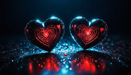 Two Futuristic Heart Shapes with Neon Lights and Sparkles