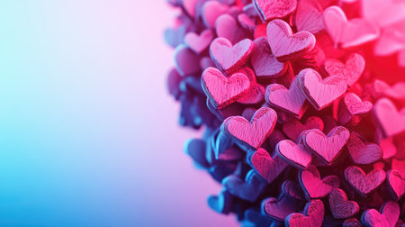 Valentine's day background with soft cloth textured shiny holographic blue and pink hearts. AI generative illustration.