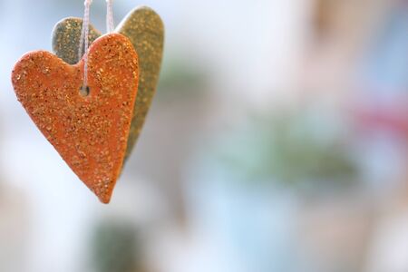 Colorful Hanging Wooden Hearts Decoration, Love, Romance, and Valentine s Day Background