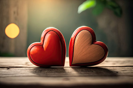 AI Generated. Two Vibrant Red Hearts on Rustic Wood Surface