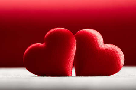 Two shiny red glass hearts close-up. Romantic, Valentines Day theme.