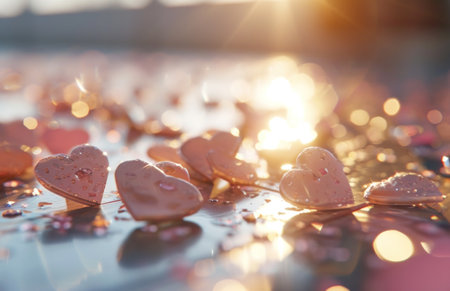 Heart-shaped confetti creates a romantic atmosphere against a dark backdrop