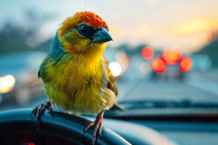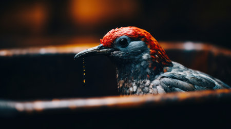 a solitary bird basks in the warm sunlight, surrounded by a captivating blend of dark gold and orange hues. the image showcases a soft focus romanticism, highlighting the bird's exaggerated facial features. through the technique of focus stacking, the dark navy and light brown tones create an intense close-up, evoking a dreamy symbolism. ai generated