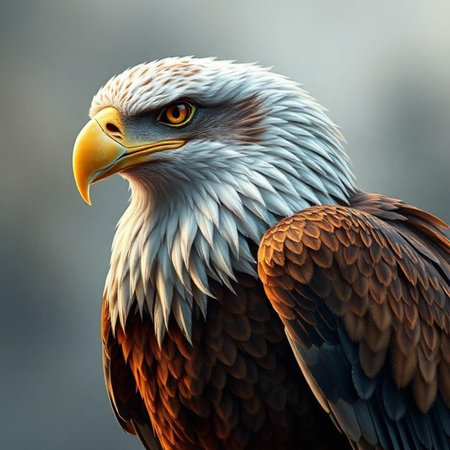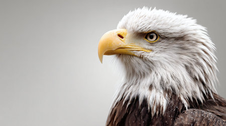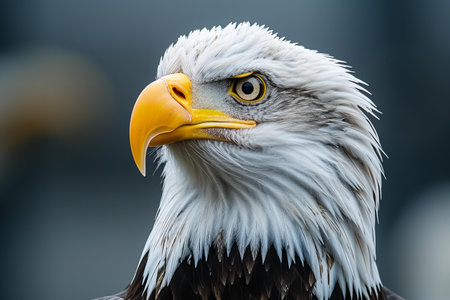 Close-up portrait of a bald eagle highlighting its impressive yellow beak and intricate feather details, set against a soft gray background that enhances its majestic presence.