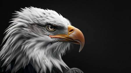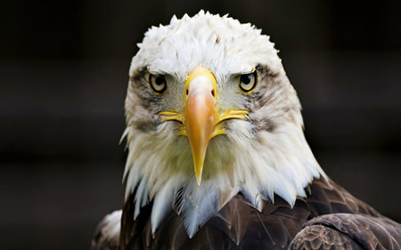 Close-up of a bald eagle, white feathers and bold stare contrasting with the black background, capturing elegance and strength.