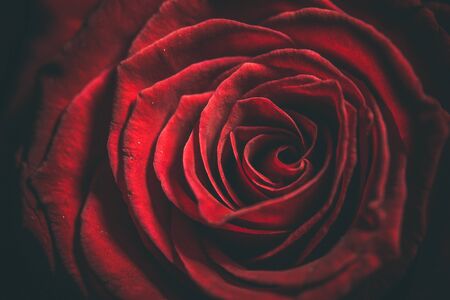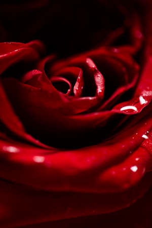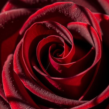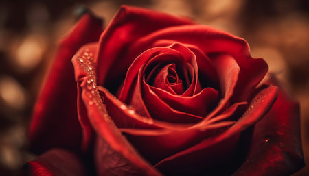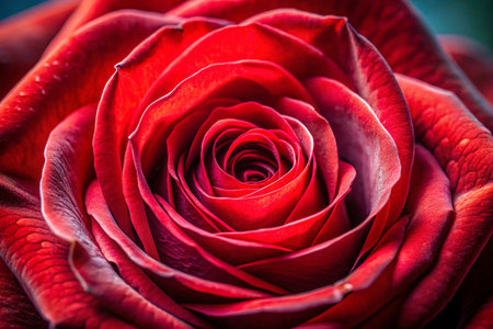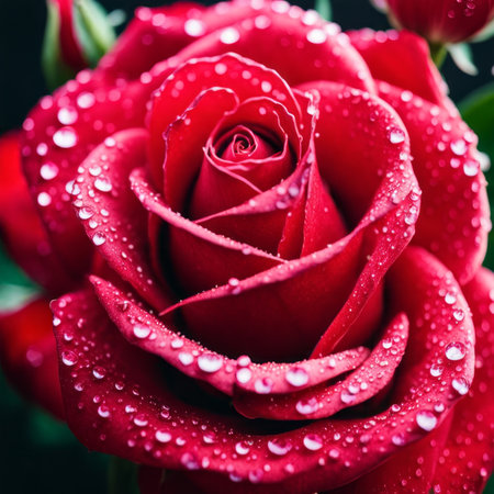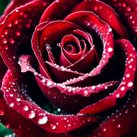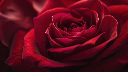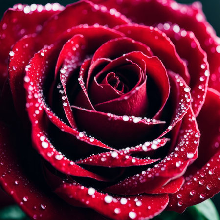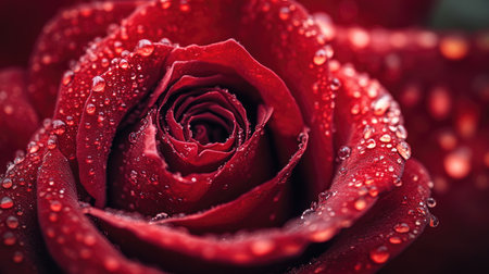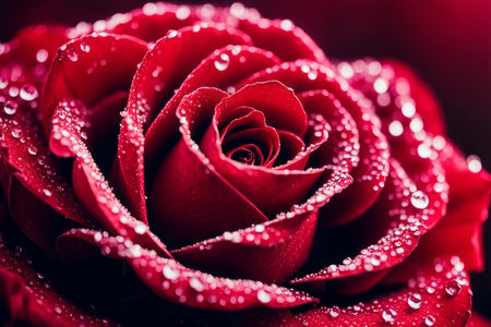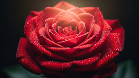 A striking macro photograph showcases a rich red rose. The image highlights intricate petal details and water droplets. The composition, lit by soft light, against a dark background, creates a romantic ambiance. This image can be used for various commercial or editorial applications.