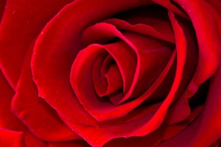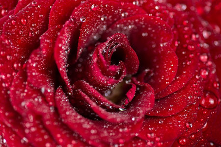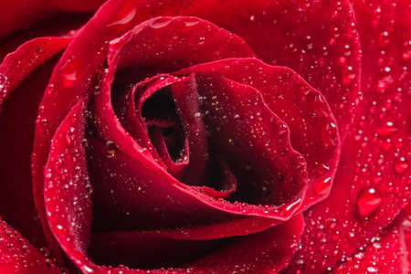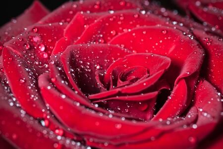 Macro image of dark red rose with water droplets. Extreme close-up .