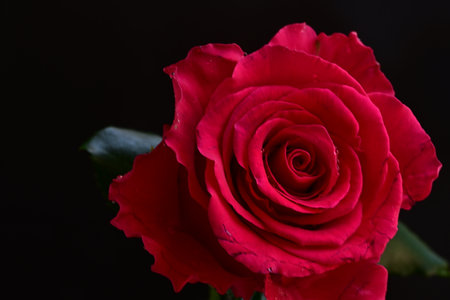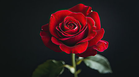 A striking close-up showcases a radiant red rose, its petals meticulously arranged. The image emphasizes the flower's texture and color against a deep black backdrop, creating a dramatic contrast. Suitable for various applications, including design projects, presentations, and marketing materials seeking botanical elegance.