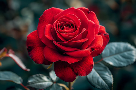 This close-up showcases a fully bloomed red rose. The image highlights the intricate details of the petals, exhibiting a rich red hue and subtle texture. The composition utilizes soft lighting to emphasize the delicate features of the flower, suggesting a natural outdoor setting. Suitable for various editorial and commercial applications.