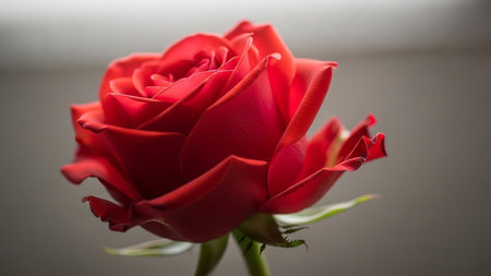 A detailed close-up shot of a single, beautiful red rose, showcasing its intricate petals and delicate form against a soft background.