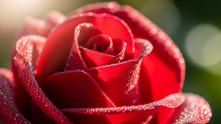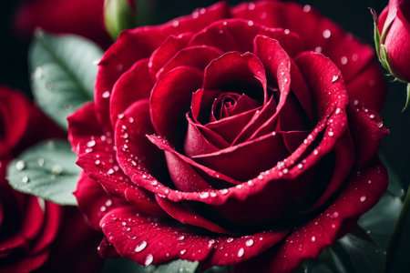 Close-up of a red rose with dew drops, detailed macro photography. Nature and beauty concept